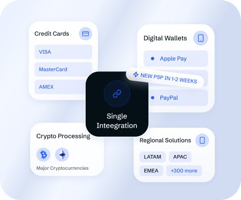 Accept Visa, Mastercard, Amex, and JCB card payments. Connect to cryptocurrency processing and 300+ alternative payment methods: PayPal, Apple Pay, Google Pay, and regional local payment solutions by market. All PSP connections go through a single technical integration to the gateway software. New PSP integrations launch in 1 to 2 weeks on request.