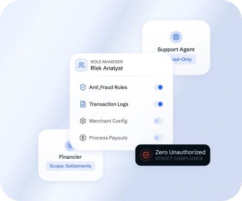 Assign access rights by role: financier, risk analyst, support agent, or custom roles defined for your team. Each user sees and can act only within their assigned scope. Reduces internal compliance risk and prevents unauthorized access to sensitive transaction data or merchant configuration.