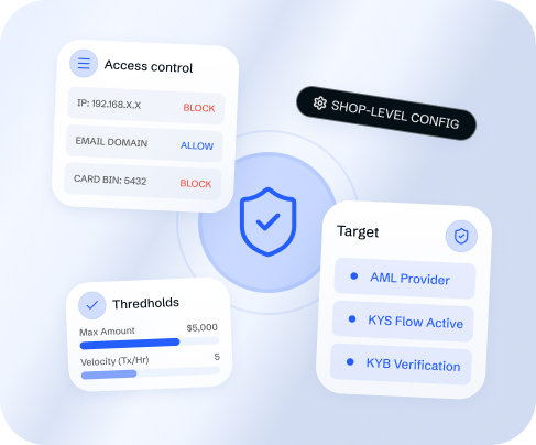 Configure internal anti-fraud rules at the shop level. Set spending thresholds, block high-risk card BINs, define rules based on customer behavior and transaction history. The solution supports third-party AML, KYC, and KYB verification service integrations directly in the payment flow. Whitelists and blacklists operate at the card, email, and IP level.