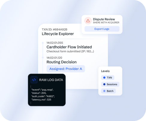 Every transaction generates multi-level logs covering each step of the payment process. Review the full cardholder flow, each PSP request and response, and every routing decision. Share logs with acquiring partners during disputes or technical reviews. Logs are available at the transaction, session, and batch level.