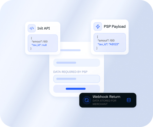 When a PSP requires specific customer or billing data that the merchant cannot send via API, the software collects those fields directly on the payment page. The data passes to the PSP at the point of transaction and returns to the merchant in the callback for use in future operations.