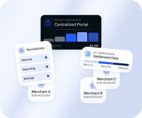 Create and manage sub-merchant accounts, set access permissions, monitor payment timelines, and access settlement data from one portal. Designed for businesses that operate multiple merchants under a single gateway – the portal provides centralized reporting and the ability to manage all merchant relationships from one dashboard.