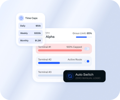 Daily, weekly, and monthly caps reset on schedule automatically. When a terminal hits its processing limit, the software deactivates it and shifts volume to the next available route within the group.