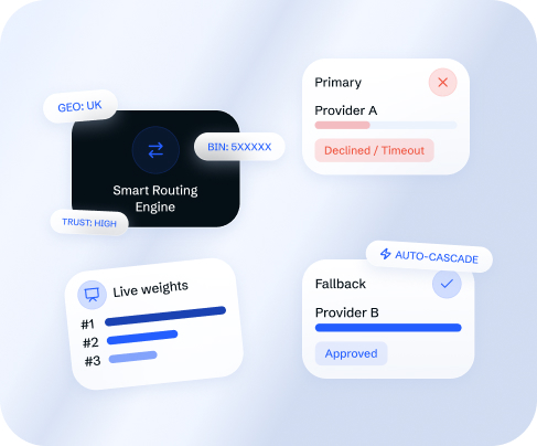 The software builds a flexible routing and cascading layer configured around multiple parameters simultaneously: GEO, currency, and amount; customer trust level; historical approval rate statistics per PSP and card type; card BIN data; and merchant-defined provider priority. When a payment fails, the system cascades automatically to the next suitable provider within the same session – cascade sequences, fallback order, and timeout thresholds are all configurable per merchant, and provider weights update continuously based on live processing statistics.